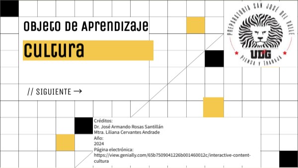 Créditos: Dr. José Armando Rosas Santillán Mtra. Liliana Cervantes Andrade Año: 2024 Página electrónica: https://view.genially.com/65b7509041226b001460012c/interactive-content-cultura