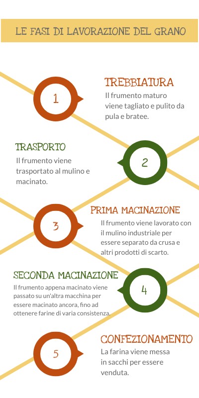 Il frumento viene lavorato con il mulino industriale per essere separato da crusa e altri prodotti di scarto.
