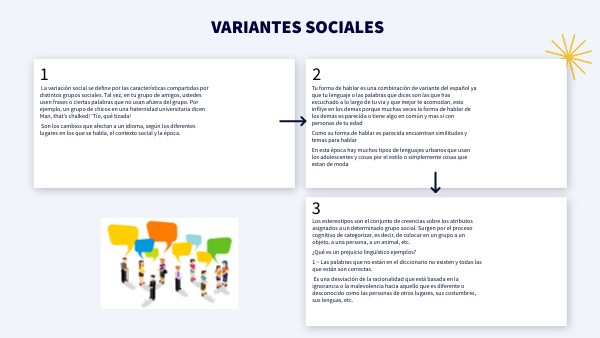 La variación social se define por las características compartidas por distintos grupos sociales. Tal vez, en tu grupo de amigos, ustedes usen frases o ciertas palabras que no usan afuera del grupo. Por ejemplo, un grupo de chicos en una fraternidad universitaria dicen Man, that's chalked! 'Tío, qué tizada! Son los cambios que afectan a un idioma, según los diferentes lugares en los que se habla, el contexto social y la época.