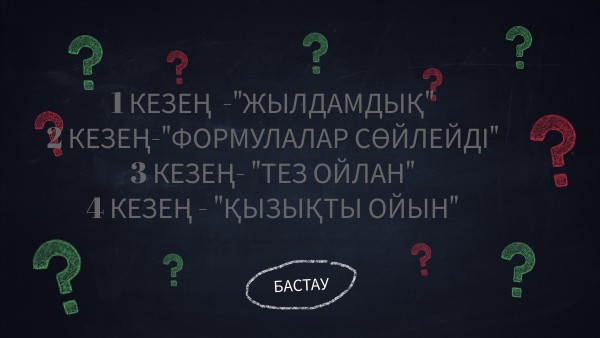 1 КЕЗЕҢ -"ЖЫЛДАМДЫҚ"2 кезең-"ФОРМУЛАЛАР СӨЙЛЕЙДІ" 3 КЕЗЕҢ- "ТЕЗ ОЙЛАН" 4 КЕЗЕҢ - "ҚЫЗЫҚТЫ ОЙЫН"