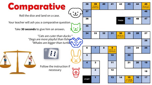 Roll the dice and land on a case. Your teacher will ash you a comparative question. Take 30 seconds to give him an answer. "Cats are cuter than ducks." "Dogs are more playful than fishes" "Whales are bigger than turtles." Follow the instruction if necessary