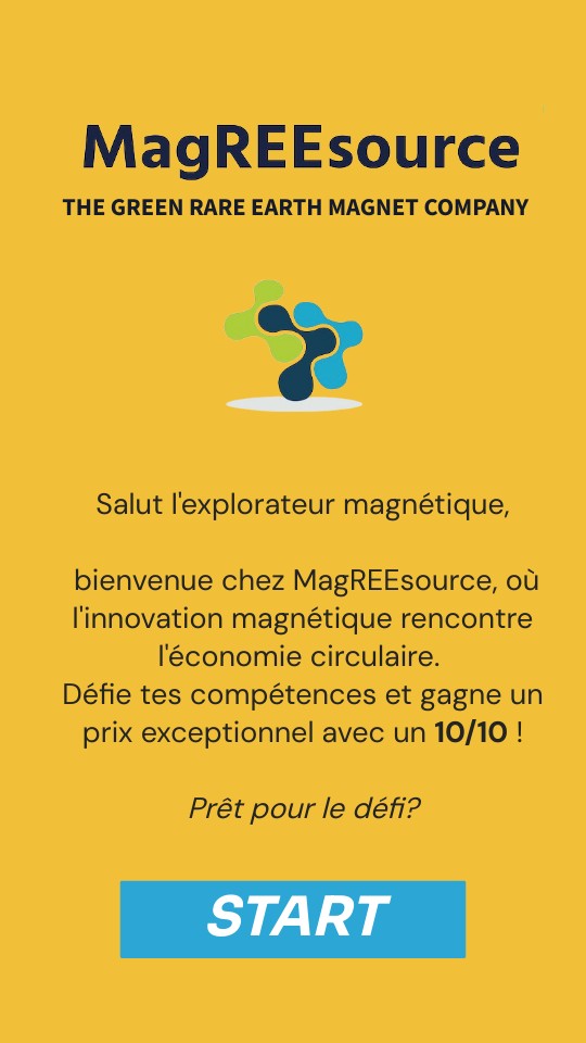 Salut l'explorateur magnétique, bienvenue chez MagREEsource, où l'innovation magnétique rencontre l'économie circulaire. Défie tes compétences et gagne un prix exceptionnel avec un 10/10 ! Prêt pour le défi?
