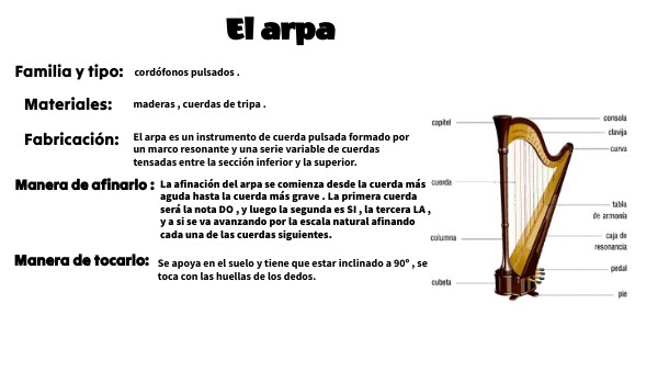 El arpa es un instrumento de cuerda pulsada formado por un marco resonante y una serie variable de cuerdas tensadas entre la sección inferior y la superior.