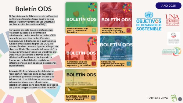 El Subsistema de Bibliotecas de la Facultad de Ciencias Sociales tiene dentro de sus tareas “Apoyar y promover los Objetivos del Desarrollo Sostenible (ODS)”. Por medio de este boletín pretendemos “Facilitar el acceso a información relacionada con las temáticas de los ODS desde la perspectiva de las Ciencias Sociales. Las bibliotecas son instituciones fundamentales para lograr los ODS. No solo están directamente ligadas al logro del objetivo 16 de “Acceso a la información”, si no que promueven todos los Objetivos de Desarrollo Sostenible a través de la alfabetización universal, incluyendo la formación de habilidades digitales e informacionales, con el apoyo de personal especializado. Además, IFLA señala que las bibliotecas ”comparten recursos en la comunidad y garantizan que todos tengan acceso a la información. Las bibliotecas colaboran internacionalmente en el préstamo interbibliotecario para garantizar que todos los países tengan acceso a la información”.
