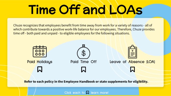 Chuze recognizes that employees benefit from time away from work for a variety of reasons - all of which contribute towards a positive work-life balance for our employees. Therefore, Chuze provides time off - both paid and unpaid - to eligible employees for the following situations.