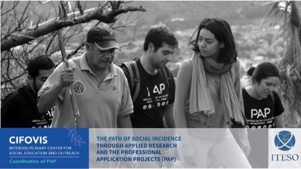 Within the framework of ITESO´s Educational Model (MEI) of 2004, the Professional Application Projects (PAP) were consolidated as an innovative educational approach, oriented towards providing social education and outreach in the curricula. For more than 16 years, the PAP have promoted the generation of alternatives and solutions to the needs and problems in different communities and contexts of our region and beyond. Each PAP is conformed in interdisciplinary groups that work through collaborative processes and interaction with social actors to achieve socioenvironmental incidence in the territories.