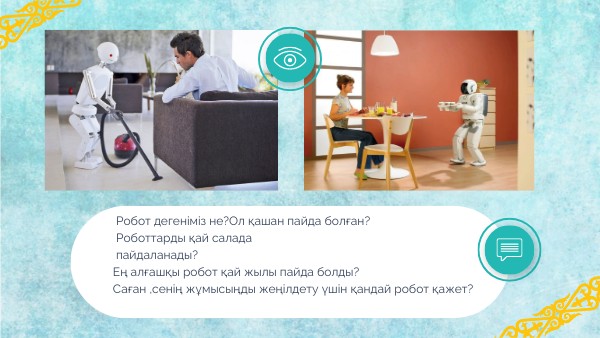 Робот дегеніміз не?Ол қашан пайда болған? Роботтарды қай салада пайдаланады? Ең алғашқы робот қай жылы пайда болды? Саған ,сенің жұмысыңды жеңілдету үшін қандай робот қажет?