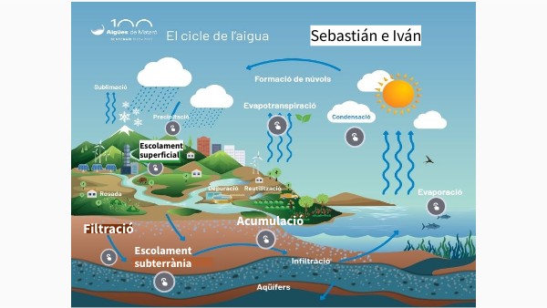 És quan un núvol s'omple d'aigua liquida i després cau del cel a la terra en forma de pluja o neu i l'aigua torna a la terra.