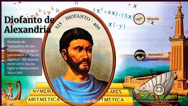 Diofanto de Alexandria foi um matemático grego e por muitos o "Pai da álgebra". Ele nasceu entre 201 e 214 no Egito e faleceu entre 284 e 298.