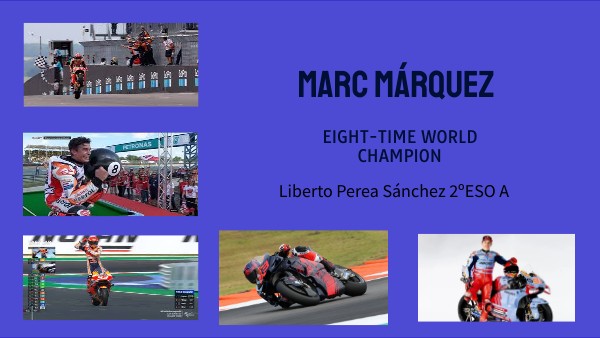 I admire M. Márquez for many reasons: 1. Because he performs a risky sport where he puts his life on the line. 2. Because he has been world champion on many occasions in different categories and beating very tough rivals. For example, beating V. Rossi. 3. He has also been a very young champion. 4. He is very funny and nice. 5. And, what I like most about him is that he has overcome himself in spite of the difficulties, that's why he is associated with the ant.