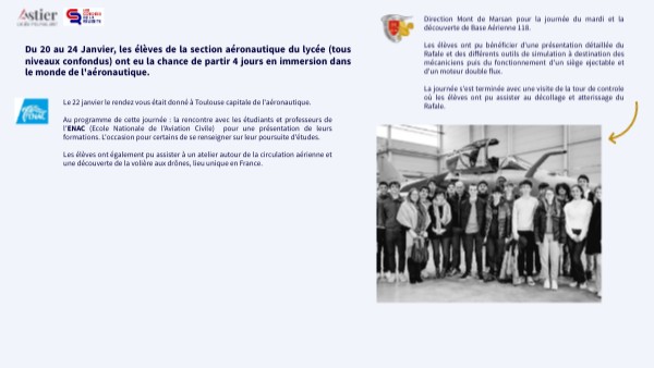 Du 20 au 24 Janvier, les élèves de la section aéronautique du lycée (tous niveaux confondus) ont eu la chance de partir 4 jours en immersion dans le monde de l'aéronautique.