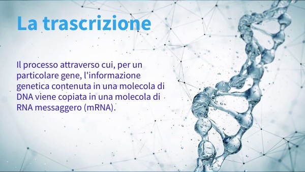 Il processo attraverso cui, per un particolare gene, l'informazione genetica contenuta in una molecola di DNA viene copiata in una molecola di RNA messaggero (mRNA).