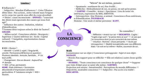 ◦Spontanée : sentiment de soi, être éveillé... ◦Réfléchie : Dédoublement de soi, on pense, on sait qu'on pense. → SARTRE = Comédie : Acteur + Spectateur : Lieu de notre vie intérieure, expression du MOI, IDENTITE. ◦Introspection : Que Homme, ø animal : Conscience d'eux extérieure, ø d'identification. FEUERBACH. Homme : Une seule et même personne : KANT.