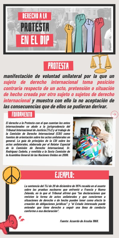 El derecho a la Protesta con el que cuentan los entes internacionales se alude a la jurisprudencia del Tribunal Internacional de Justicia (TIJ) y al trabajo de la Comisión de Derecho Internacional (CDI) como fuentes de orientación sobre los actos unilaterales en general. La guía de principios de la CDI sobre los actos unilaterales, elaborada por el Relator Especial de la Comisión de Derecho Internacional, Sr. Rodríguez Cedeño, y remitida a la Sexta Comisión de la Asamblea General de las Naciones Unidas en 2006.