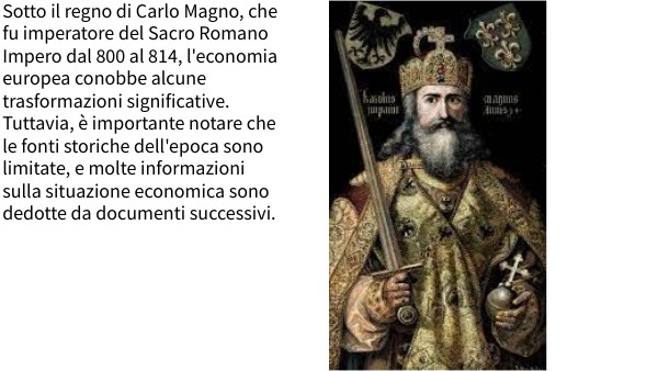 Sotto il regno di Carlo Magno, che fu imperatore del Sacro Romano Impero dal 800 al 814, l'economia europea conobbe alcune trasformazioni significative. Tuttavia, è importante notare che le fonti storiche dell'epoca sono limitate, e molte informazioni sulla situazione economica sono dedotte da documenti successivi.