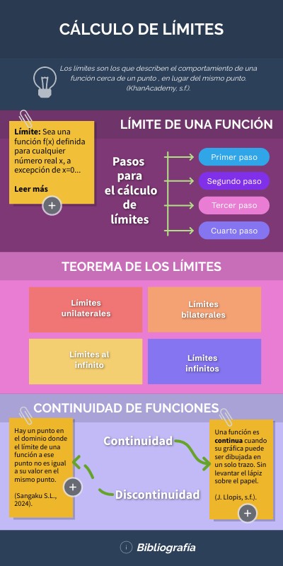 Bibliografía Juárez, N. C. (s.f.). Introducción a límites (artículo). Khan Academy. [Consultado el 30 de enero de 2024], recuperado de https://es.khanacademy.org/math/ap-calculus-ab/ab-limits-new/ab-1-2/a/limits-intro Matefacil (s.f.). Continuidad de funciones (con ejercicios). Matefacil. [Consultado el 30 de enero de 2024], Recuperado de https://www.matesfacil.com/resueltos-continuidad.htm Rangel Torres, E. M. (s.f.). L9. Teorema de los límites, Álgebra II. UVEG, [Consultado el 30 de enero, 2024]. Recuperado de https://avalicmod19b.uveg.edu.mx/mod/scorm/player.php?a=387¤torg=Algebra_L8_Leccion_teorema_de_limites_ORG&scoid=797&newattempt=on Sangaku S.L. (2024) Discontinuidad de funciones: evitable, inevitable (o de salto finito) y esencial. sangakoo.com. [Consultado el 30 de enero de 2024] Recuperado de https://www.sangakoo.com/es/temas/discontinuidad-de-funciones-evitable-inevitable-o-de-salto-finito-y-esencial