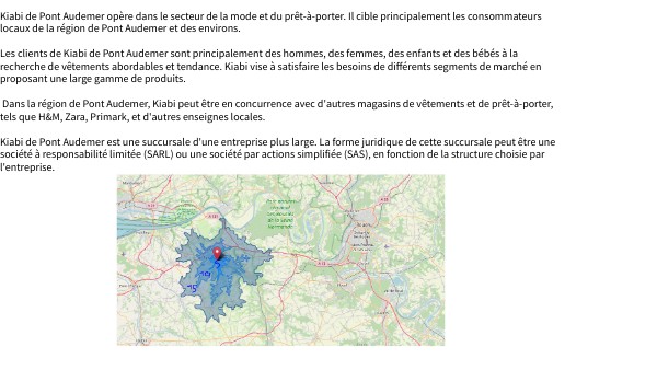 Kiabi de Pont Audemer opère dans le secteur de la mode et du prêt-à-porter. Il cible principalement les consommateurs locaux de la région de Pont Audemer et des environs. Les clients de Kiabi de Pont Audemer sont principalement des hommes, des femmes, des enfants et des bébés à la recherche de vêtements abordables et tendance. Kiabi vise à satisfaire les besoins de différents segments de marché en proposant une large gamme de produits. Dans la région de Pont Audemer, Kiabi peut être en concurrence avec d'autres magasins de vêtements et de prêt-à-porter, tels que H&M, Zara, Primark, et d'autres enseignes locales. Kiabi de Pont Audemer est une succursale d'une entreprise plus large. La forme juridique de cette succursale peut être une société à responsabilité limitée (SARL) ou une société par actions simplifiée (SAS), en fonction de la structure choisie par l'entreprise.
