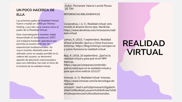 REFERENCIAS BIBLIOGRAFICAS Corporativa, I. (s. f.). Realidad virtual: otro mundo al alcance de tus ojos. Iberdrola. https://www.iberdrola.com/innovacion/realidad-virtual Lemus, K. (2023, 7 septiembre). Realidad Virtual al Detalle: Qué es y Cómo Funciona. inmersys. https://blog.inmersys.com/que-es-y-como-funciona-la-realidad-virtual Rpp, R. (2018, 20 septiembre). ¿Qué es la realidad virtual y para qué sirve? RPP Noticias. https://rpp.pe/campanas/contenido-patrocinado/que-es-la-realidad-virtual-y-para-que-sirve-noticia-1151127 Innovae. (s. f.). Realidad virtual. Innovae. https://www.innovae.com/la-tecnologia-de-realidad-virtual/#:~:text=Las%20primeras%20gafas%20de%20Realidad,usuario%20disfrutar%20de%20experiencias%20multisensoriales.