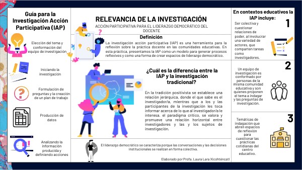 La investigación acción participativa (IAP) es una herramienta para la reflexión sobre la práctica docente en las comunidades educativas. En esta práctica, presentamos la IAP como un modelo para generar procesos reflexivos y como una forma de crear espacios de liderazgo democrático.