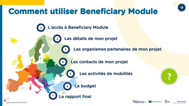 Pour trouver le lien vers Beneficiary Module je me rends dans l'onglet suivi du projet de mon espace utilisateur "MonProjetErasmus+"