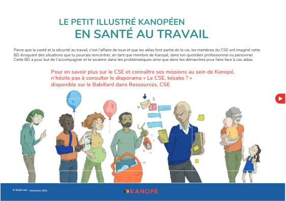 Parce que la santé et la sécurité au travail, c’est l’affaire de tous et que les aléas font partie de la vie, les membres du CSE ont imaginé cette BD évoquant des situations que tu pourrais rencontrer, en tant que membre de Kanopé, dans ton quotidien professionnel ou personnel. Cette BD a pour but de t’accompagner et te soutenir dans tes problématiques ainsi que dans tes démarches pour faire face à ces aléas.