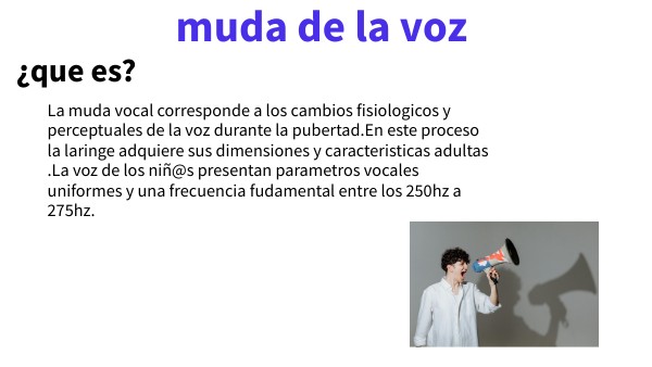 La muda vocal corresponde a los cambios fisiologicos y perceptuales de la voz durante la pubertad.En este proceso la laringe adquiere sus dimensiones y caracteristicas adultas .La voz de los niñ@s presentan parametros vocales uniformes y una frecuencia fudamental entre los 250hz a 275hz.