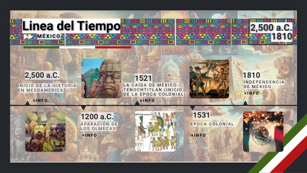 Los Olmecas, la primera civilización, vivieron alrededor del 1200 a.C. en lo que hoy es México. Sus ciudades principales eran La Venta, Tres Zapotes y San Lorenzo. Tenían una sociedad con muchos niveles y su economía se basaba en la agricultura y el comercio. También eran conocidos por su arte, especialmente por las grandes cabezas de piedra que dejaron.