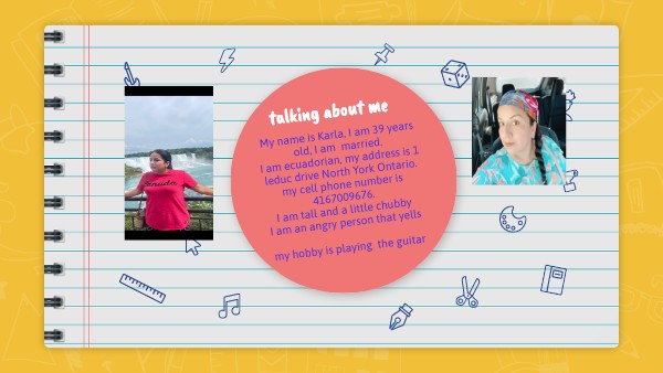 My name is Karla, I am a student , I live in Canada around 10 years I am studying english and learning a lot .