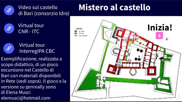 Esemplificazione, realizzata a scopo didattico, di un gioco escursione nel Castello di Bari con materiali disponibili in Rete (vedi sopra). Il gioco e la versione su gennially sono di Elena Musci elemusci@hotmail.com