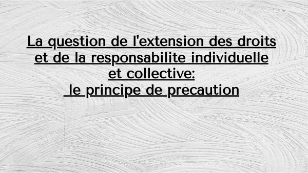 I) Introduction-A) Explication extension des droits, responsabilité individuelle et collective -B) Définition principe de précautionII) Le principe de précaution-A) Origines et fondements -B) Lien entre droit et responsabilité individuelle/collectiveIII) Exemples et contraintes-A) Exemples -B) Les défis critiques