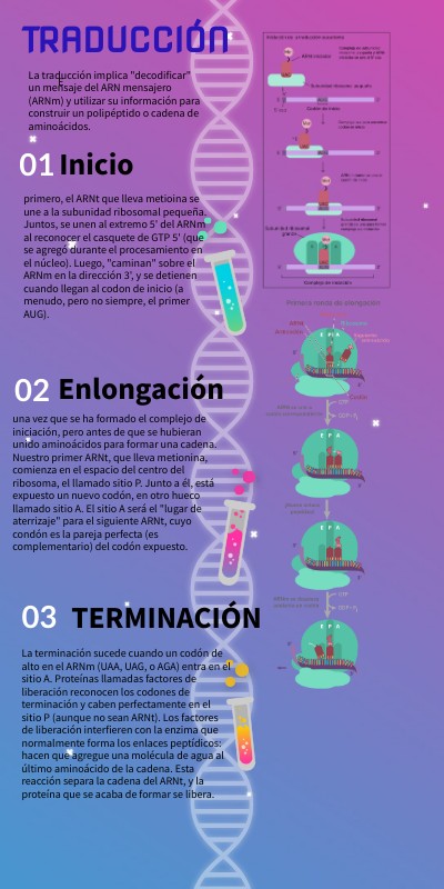 La traducción implica "decodificar" un mensaje del ARN mensajero (ARNm) y utilizar su información para construir un polipéptido o cadena de aminoácidos.