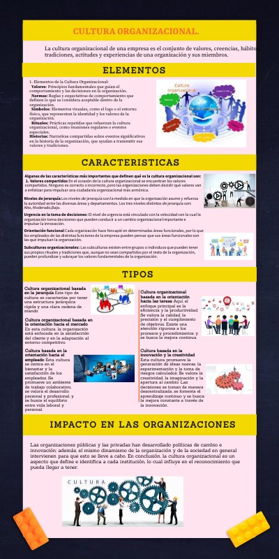 1. Elementos de la Cultura Organizacional: Valores: Principios fundamentales que guían el comportamiento y las decisiones en la organización. Normas: Reglas y expectativas de comportamiento que definen lo que se considera aceptable dentro de la organización. Símbolos: Elementos visuales, como el logo o el entorno físico, que representan la identidad y los valores de la organización. Rituales: Prácticas repetidas que refuerzan la cultura organizacional, como reuniones regulares o eventos especiales. Historias: Narrativas compartidas sobre eventos significativos en la historia de la organización, que ayudan a transmitir sus valores y tradiciones.