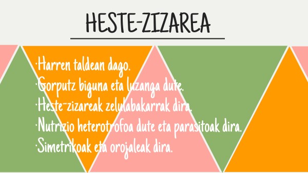 ·Harren taldean dago. ·Gorputz biguna eta luzanga dute.·Heste-zizareak zelulabakarrak dira. ·Nutrizio heterotrofoa dute eta parasitoak dira. ·Simetrikoak eta orojaleak dira.