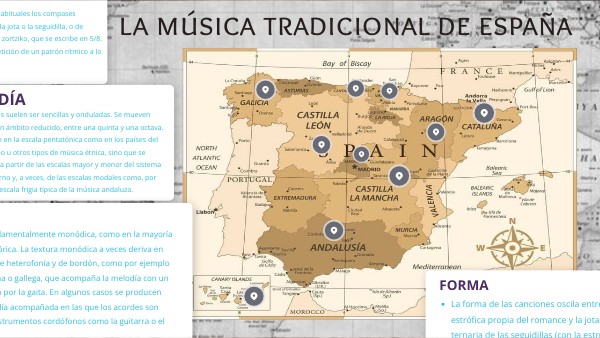 - Ritmos libres, son habituales los compases ternarios, como en la jota o la seguidilla, o de amalgama, como el zortziko, que se escribe en 5/8. Es frecuente la repetición de un patrón rítmico a lo largo de la pieza.