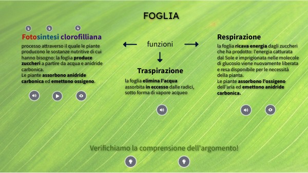 processo attraverso il quale le piante producono le sostanze nutritive di cui hanno bisogno: la foglia produce zuccheri a partire da acqua e anidride carbonica. Le piante assorbono anidride carbonica ed emettono ossigeno.
