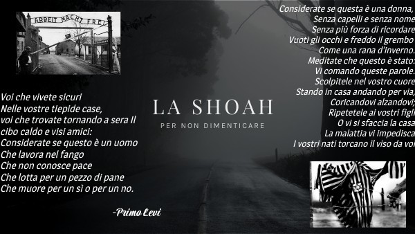 Considerate se questa è una donna, Senza capelli e senza nome Senza più forza di ricordare Vuoti gli occhi e freddo il grembo Come una rana d’inverno. Meditate che questo è stato: Vi comando queste parole.Scolpitele nel vostro cuore Stando in casa andando per via,Coricandovi alzandovi;Ripetetele ai vostri figliO vi si sfaccia la casaLa malattia vi impediscaI vostri nati torcano il viso da voi