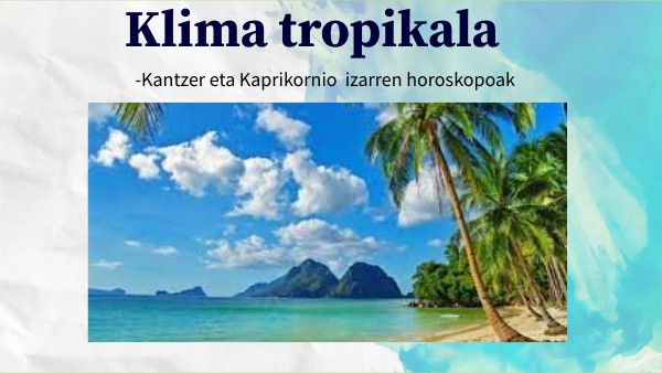 Ingurune tropikala...(abestia) beroa,beroa(Dayana baxuan)18 gradu baino baxuagoak,irregularak eta ugariak montzoiak batzuetan.Ibaiak aldaketa handiak,Nilo,Ninger eta Ganges,landaredia zonalde hezea: basoa zonalde lehorra: sabana(Belar garaiak Lorea), fauna urtaro aldaketara ,belarjaleak panda ta haragijaleak lehoia. Lurzorua gorri tropikala. biztanleria dentsitate handia kostan, deltetan ta mendietan, jarduera ekonomikoak tradizionalak:nekazaritza luberrikoa sedentarioa abeltzaintza nomada, modernoak industriarentzat bideratutako abeltzaintza turismoa