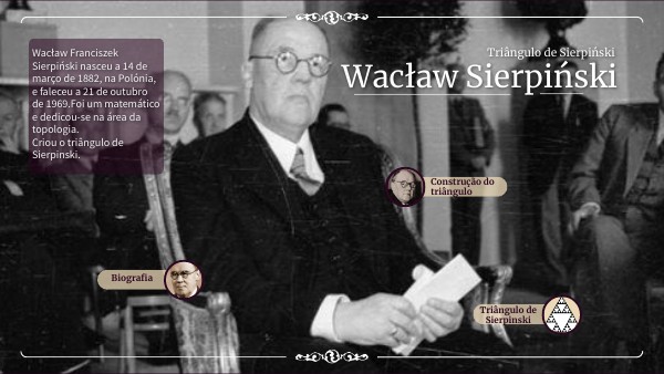 Wacław Franciszek Sierpiński nasceu a 14 de março de 1882, na Polónia, e faleceu a 21 de outubro de 1969.Foi um matemático e dedicou-se à área da topologia. Criou o triângulo de Sierpinski.