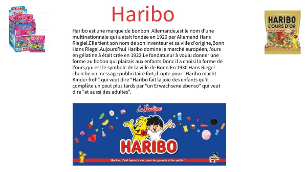 Haribo est une marque de bonbon Allemande,est le nom d'une multinationnale qui a etait fondée en 1920 par Allemand Hans Riegiel.Elle tient son nom de son inventeur et sa ville d'origine,Bonn Hans Riegel.Aujourd'hui Haribo domine le marché européen,l'ours en gélatine à était crée en 1922.Le fondatueur à voulu donner une forme au bobon qui plairais aux enfants.Donc il a choisi la forme de l'ours,qui est le symbole de la ville de Bonn.En 1930 Hans Riegel cherche un message publicitaire fort,il opte pour "Haribo macht Kinder froh" qui veut dire "Haribo fait la joie des enfants qu'il complète un peut plus tards par "un Erwachsene ebenso" qui veut dire "et aussi des adultes".