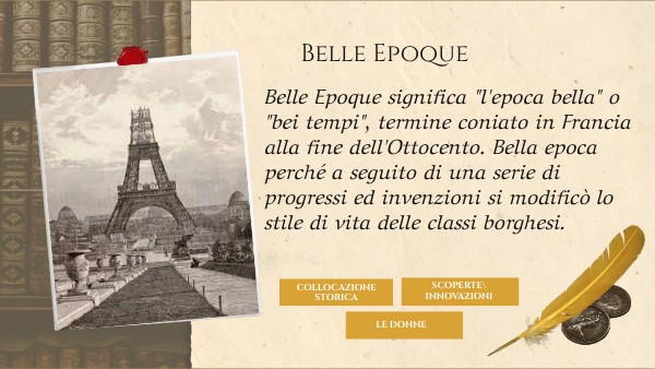 Belle Epoque significa "l'epoca bella" o "bei tempi", termine coniato in Francia alla fine dell'Ottocento. Bella epoca perché a seguito di una serie di progressi ed invenzioni si modificò lo stile di vita delle classi borghesi.
