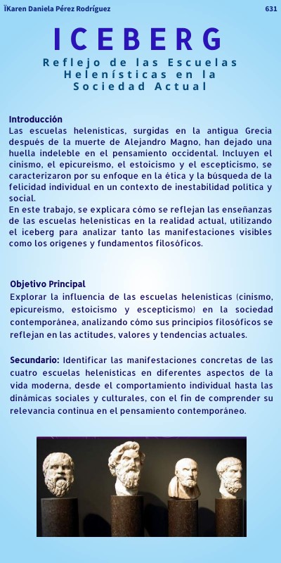 IntroducciónLas escuelas helenísticas, surgidas en la antigua Grecia después de la muerte de Alejandro Magno, han dejado una huella indeleble en el pensamiento occidental. Incluyen el cinismo, el epicureísmo, el estoicismo y el escepticismo, se caracterizaron por su enfoque en la ética y la búsqueda de la felicidad individual en un contexto de inestabilidad política y social. En este trabajo, se explicara cómo se reflejan las enseñanzas de las escuelas helenísticas en la realidad actual, utilizando el iceberg para analizar tanto las manifestaciones visibles como los orígenes y fundamentos filosóficos.