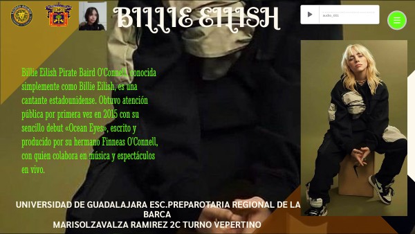 Billie Eilish Pirate Baird O'Connell Nacida el 18 de diciembre de 2001, En Los Angeles California . Es una cantante pop norteamericana. Suele componer en colaboración con su hermano Finneas, que es también el productor de muchas de sus canciones y la acompaña en sus actuaciones. Se la considera uno de los fenómenos musicales de mayor impacto de los últimos años.