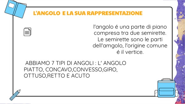 l'angolo é una parte di piano compresa tra due semirette.Le semirette sono le parti dell'amgolo, l'origine comune é il vertice.