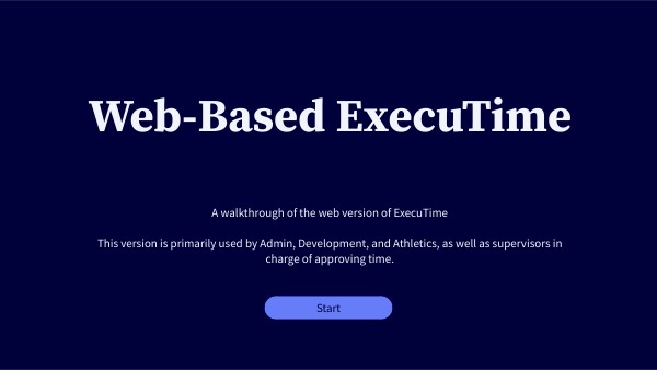 A walkthrough of the web version of ExecuTime This version is primarily used by Admin, Development, and Athletics, as well as supervisors in charge of approving time.