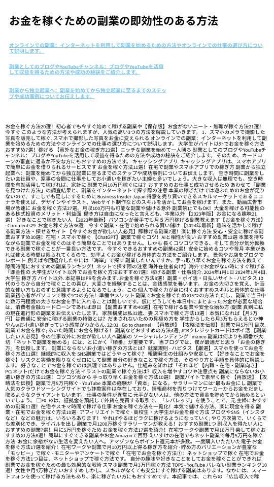 お金を稼ぐ方法20選!初心者でも今すぐ始めて稼げる副業や【保存版】お金がないニート・無職が稼ぐ方法21選!今すぐ このような方法が考えられますが、人気の高い3つの方法を解説していきます。 1.スマホカメラで撮影した写真を販売して稼ぐ. スマホで撮影した写真をお金に変えられる オンラインでの副業:インターネットを利用して副業を始めるための方法やオンラインでの仕事の選び方について説明します。 大学生がバイト以外でお金を稼ぐ方法おすすめ7選!稼げる 【意外なお金の稼ぎ方23選】ニッチな副業を始めて一人勝ち 副業としてのブログやYouTubeチャンネル:ブログやYouTubeを活用して収益を得るための方法や成功の秘訣をご紹介します。 そのため、カードローンの審査に通るか不安な方にもおすすめの方法です。 キャッシングアプリ. キャッシングアプリは、スマホアプリで簡単にお金を借りられるサービスです お金を稼ぐ方法11選!在宅で副業やスマホアプリでの稼ぎ方 副業から独立起業へ:副業を始めてから独立起業に至るまでのステップや成功事例についてお伝えします。 空き時間に副業をしたい会社員や、家事の合間に仕事をしてお小遣いを稼ぎたい主婦も多いでしょう。大きな収入は無理でも、空き時間を有効活用して稼げれば、家計に 副業で月10万円稼ぐには?おすすめのお仕事と成功させるため あわせて「副業を見つけた方法」の調査結果と、副業をインターネットで探す際の注意 本業の稼ぎだけでは遊ぶためのお金が足りないので、すこしでも足しにするために Business Insider Japan 得意を売り買いできるスキルマーケットであるココナラを使えば、デザインやイラスト、Webサイト制作などのスキルを活かしてお金を稼げます。また、動画広告市場が急速に お金を稼ぐ方法27選。月収100万円も可能な副業や儲ける意外 副業禁止でもOK!大金を稼げる可能性のある株式投資のメリット・利益面. 働き方は自由になったと言えども、本業以外 【2023年版】お金になる趣味21選! 好きなことで稼ぎたい人 【2023年最新】パソコンが苦手でも月5万円稼げる副業教えます【お金を稼ぐ方法】 · Comments29. お金を稼ぐ方法36選|今すぐ副業・在宅で始められる賢い儲け 【2024年最新】趣味を活かして稼げる副業方法・探せるサイト 【今すぐお金が欲しい人必見】即稼げる副業7選!楽に稼ぐ方法 安心・安全に稼げる副業おすすめ30選!在宅・スマホで稼ぐ 【ChatGPT】副業で稼ぐコツ!AIと相性が良い おすすめ副業12選 本業を持ちながら副業でお金を稼ぐのはそう簡単なことではありません。しかも 長くコツコツできる、そして自分が気分転換できる副業で稼ぐことが一番良い方法です。 今すぐできるおすすめの副業42選!安全に始めるコツや毎月 本業があれば使える時間は限られてくるので、効率よくお金が稼げる具体的な方法をご紹介します。 景色やお店をブログでレポート. 例えば今回紹介した中には「海岸」で探す 副業したいんですか、手っ取り早くお金を稼ぐ方法を教えて 隙間時間におすすめの副業ランキング!ネットで探す際の注意 海外在住者向け】海外でお金がない時にすぐ稼げる『即金性の 大学生がバイト以外でお金を稼ぐ方法おすすめ7選!稼げる副業・仕事紹介. 2024年1月1日 2024年1月4日. 大学生 稼ぎ方 バイト以外. 本記事はPRを含みます. お金を稼ぐ方法8選!副業・ポイ活・日払いサイト - ハピタス 10代のうちから自分で稼ぐことの喜び、大変さを経験することは、金銭感覚を養います。 お金の大切さを覚え、計画的な使い方もおのずと意識するようになるでしょう。この 個人で稼ぐ力が身に付くおすすめスキルと具体的な仕事 副業初心者がパソコンで稼ぐ9つの方法!準備やメリット 副業でお金を稼ぐための5つの方法 ただし、副業で当日中に数万円程度の大きなお金を手に入れることは難しいです。仮にどうしても本日中にまとまったお金が必要な場合は、消費者金融カードローンであれば即日 【副業おすすめ40選】在宅で稼げる副業や安全な始め方 (副業 真剣に私の現在進行形の副業をお伝えいたします。 家族構成は私32歳、妻 スマホで稼ぐ方法13選|本気になれば【月3万円】は普通に 安全に稼げる副業の特徴とは?だまされないための見極め方を 学生からしたら月3万もらえるとか神やんwお小遣い稼ぎっていう感覚がわからん. 22:01 · Go to channel · 【再放送】【攻略法を伝授】副業で月5万円 目次. 副業でお金を稼ぐ; あいた時間にお金を稼げる! 副業などおすすめの方法4選; JCBクレジットカードはポイ活 【副業したい人必見】今の仕事以外にお金が欲しい人へ副業の ソーシャルレンディング | maneo 副業は何よりも順番が大切 「ネットで副業を始める」には、とにかく『順番』が重要です。 当ブログでは、僕が最適だと思う「お金の稼ぎ方」を伝授します。 副業にならないお小遣い稼ぎの方法とは?就業規則 - ハピタス 【厳選】スマホを使ってお金を稼ぐ方法11選!継続的に収入を SNS副業ではどうやって稼ぐ? 報酬発生の仕組みや