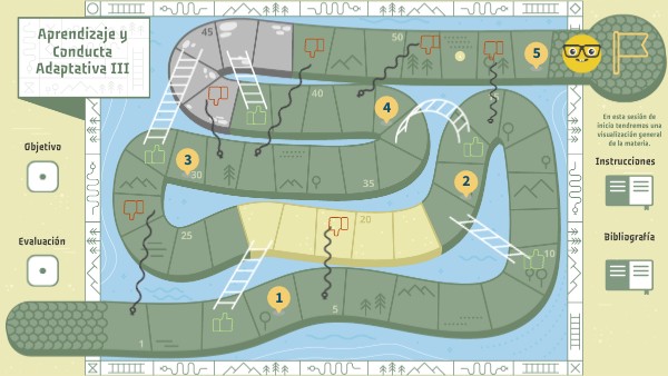 INSTRUCCIONES Los estudiantes comienzan con una ficha —que representa a cada uno de ellos— a diferencia de otros juegos, cada uno puede avanzar a su propio ritmo. El avance es de manera ascendente. Si al avanzar un jugador cae en un casillero en donde comienza una escalera, sube por ella hasta el casillero donde ésta termina, lo cual significa que hay acciones que nos ayudan a avanzar en este "juego". Si, por el contrario, realiza otras actividades, eso será como caer en la cola de una serpiente, lo que significa que encontrará mayores complicaciones para concluir con éxito este "juego". A diferencia del juego que conocemos donde hay que esperar nuestro turno para tirar los dados, aqui no existen dados, ni un horario específico para "jugar"; se trata de que organices adecuamente tus tiempos y actividades de tal forma que puedas dedicar el suficiente tiempo y energia para concluír con éxito la materia.