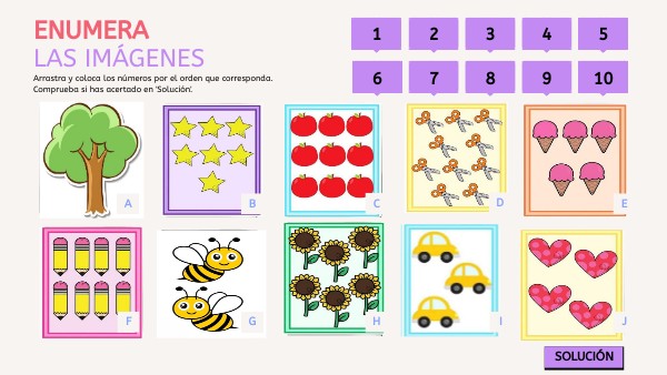 Arrastra y coloca los números por el orden que corresponda. Comprueba si has acertado en 'Solución'.