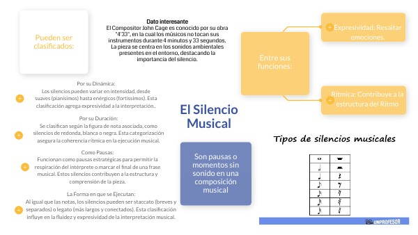 Dato interesanteEl Compositor John Cage es conocido por su obra "4'33", en la cual los músicos no tocan sus instrumentos durante 4 minutos y 33 segundos. La pieza se centra en los sonidos ambientales presentes en el entorno, destacando la importancia del silencio.