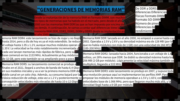 Desde la implantación de la memoria RAM en formato DIMM, son muchos los tipos de memorias que ha habido en el mercado, pero desde el año 2000 son las memorias RAM DDR las que se han impuesto por encima de las demás. A continuación, te vamos a contar qué diferencias tiene la memoria RAM DDR, DDR2, DDR3, DDR4 y DDR5 desde su implantación en el año 2000.