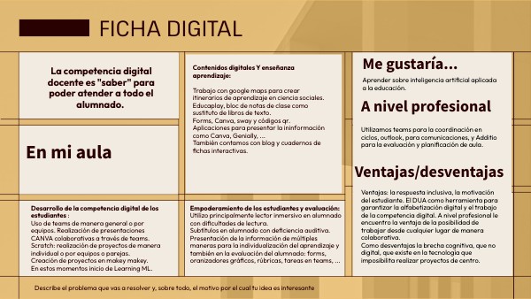 Contenidos digitales Y enseñanza aprendizaje: Trabajo con google maps para crear itinerarios de aprendizaje en ciencia sociales. Educaplay, bloc de notas de clase como sustituto de libros de texto. Forms, Canva, sway y códigos qr. Aplicaciones para presentar la ininformación como Canva, Genially, ... También contamos con blog y cuadernos de fichas interactivas.